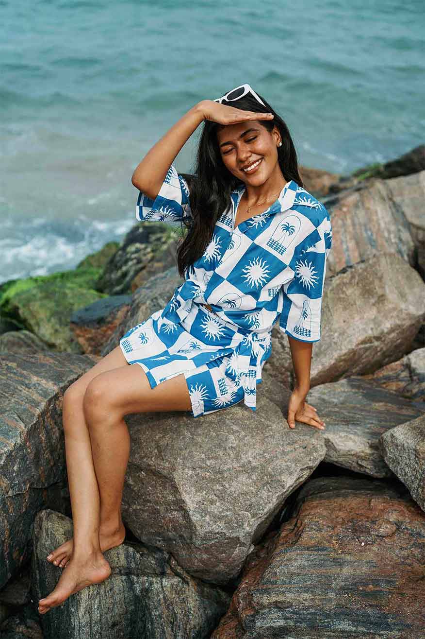 Breezy and bold, this oversized blue printed shirt is your perfect holiday companion. Light, comfy, and effortlessly stylish.